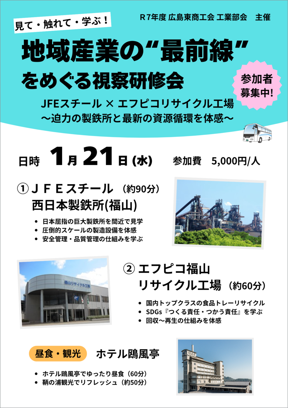 【1/21開催】日帰り視察研修会(JFEスチール㈱西日本製鉄所・エフピコ福山リサイクル工場) 参加者募集中!!